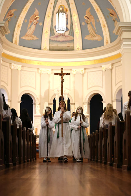 Our vibrant faith life is woven into the fabric of everyday experience. As a school community, we come together regularly to celebrate the Holy Mass, deepening our connection to Christ and to one another. Students engage in daily religion classes that explore Catholic teachings, Scripture, and moral development. Our annual class retreats offer sacred time for reflection, renewal, and bonding, while monthly Eucharistic Adoration invites students into the quiet, transformative presence of Christ. Through our dynamic Campus Ministry club, students take an active role in leading spiritual initiatives, service projects, and peer ministry.